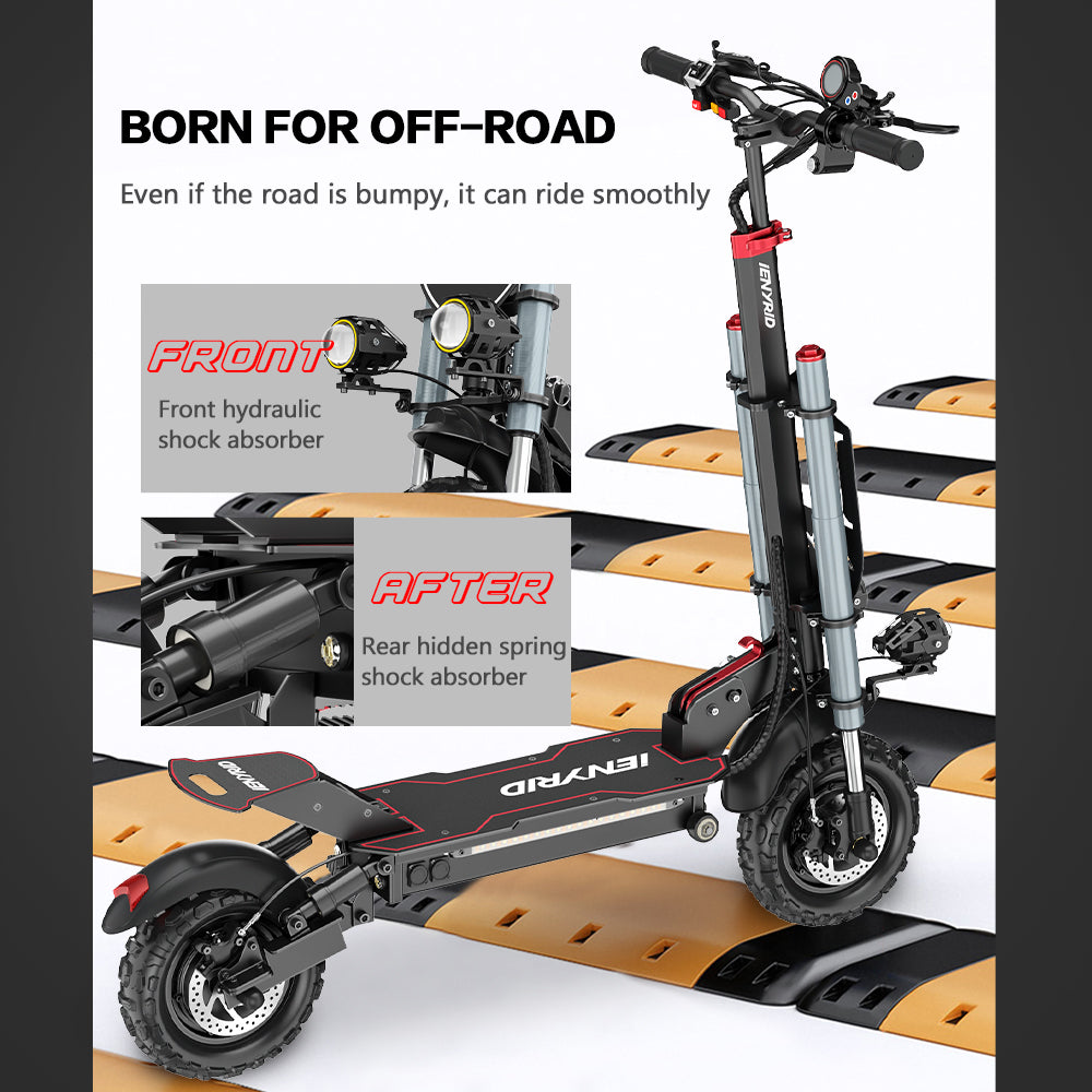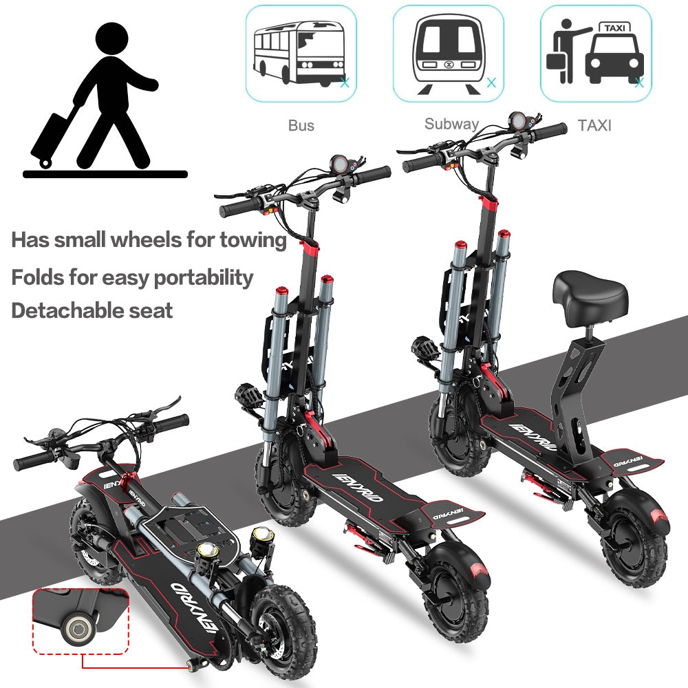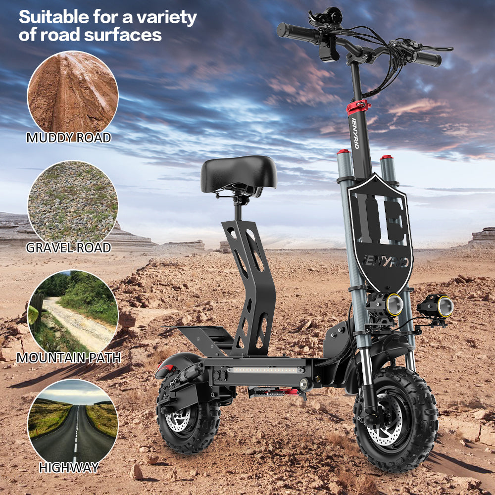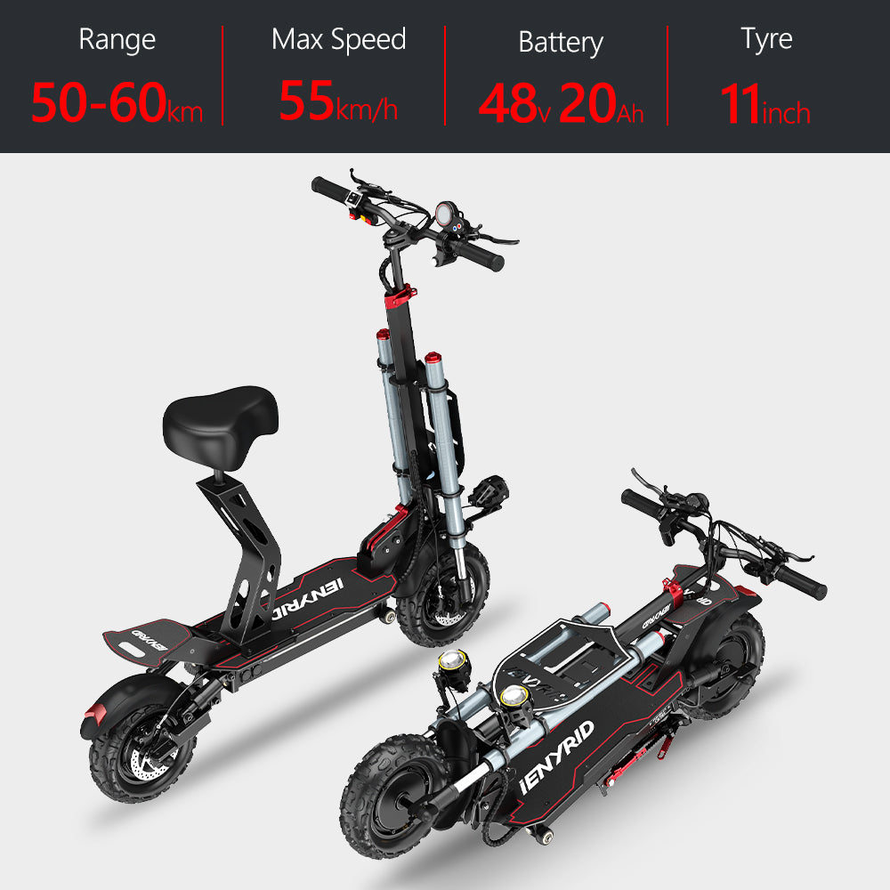 iENYRID ES20 off road all terrain electric scooter comes with dual 1200W motor, 48V 20Ah battery, 11 inch big tire, max speed 55 km/h, long range 50-60 km, max load 150 kg.