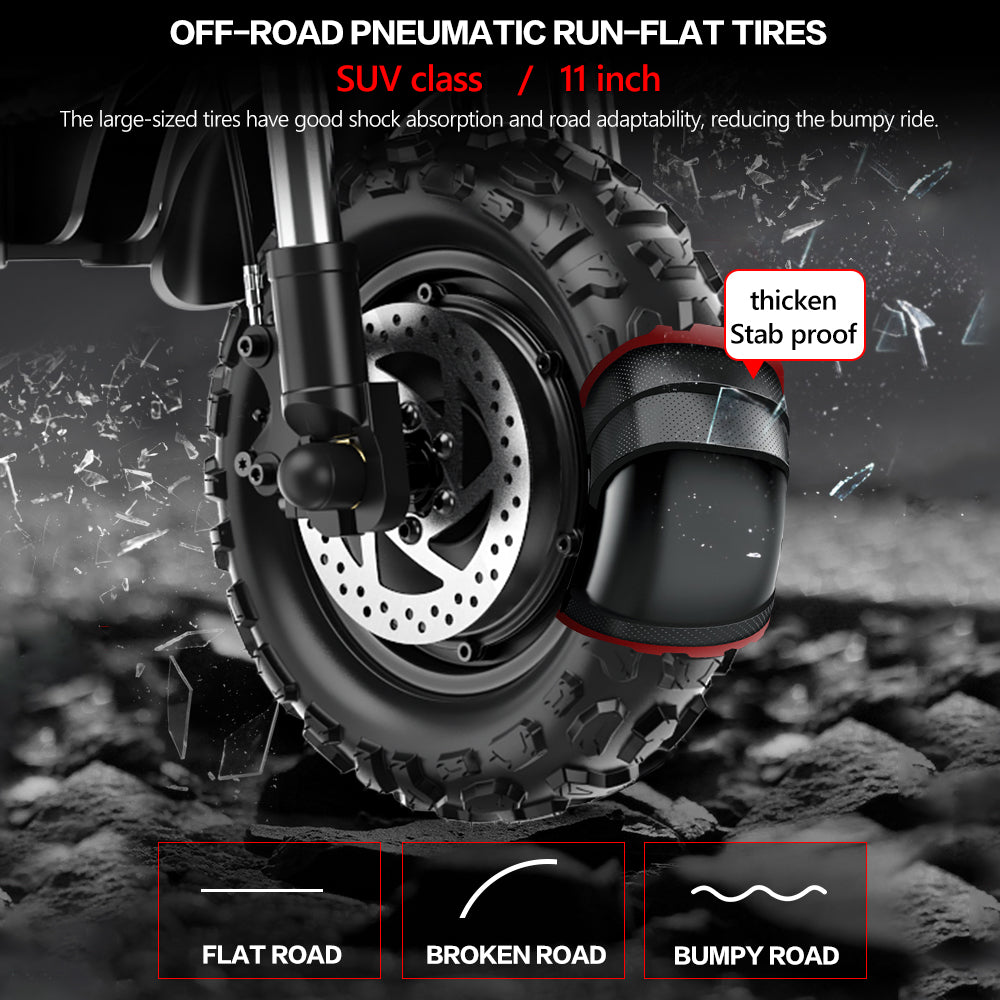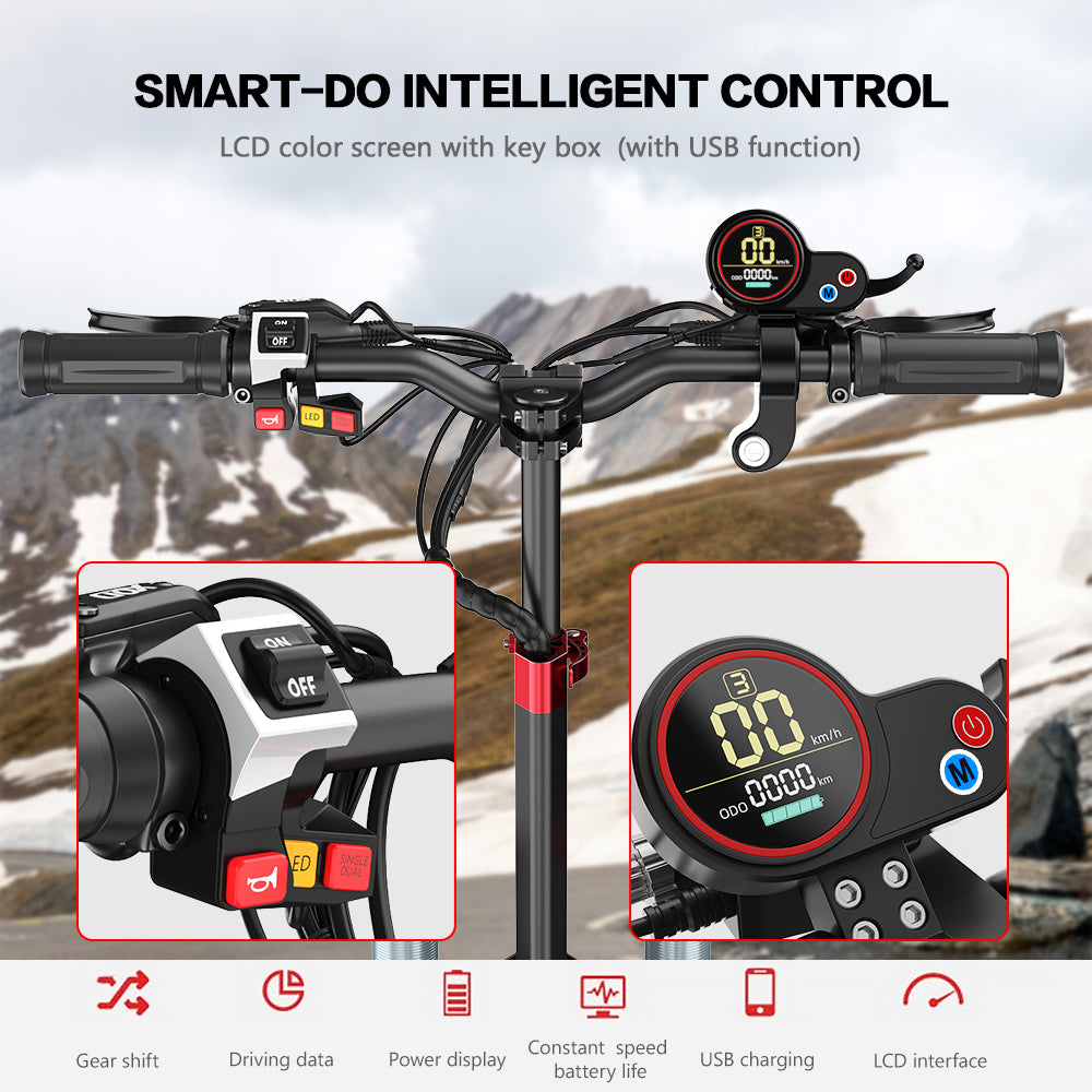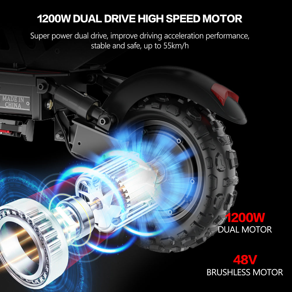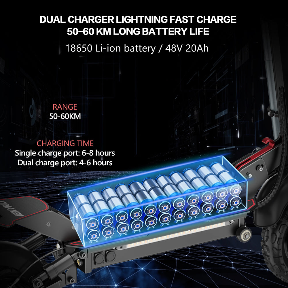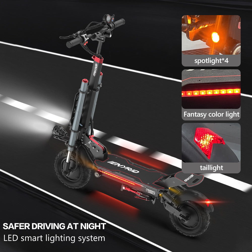 iENYRID ES20 off road all terrain electric scooter comes with dual 1200W motor, 48V 20Ah battery, 11 inch big tire, max speed 55 km/h, long range 50-60 km, max load 150 kg.